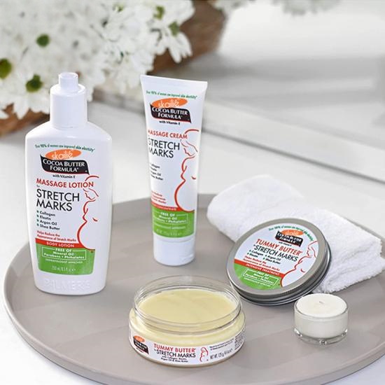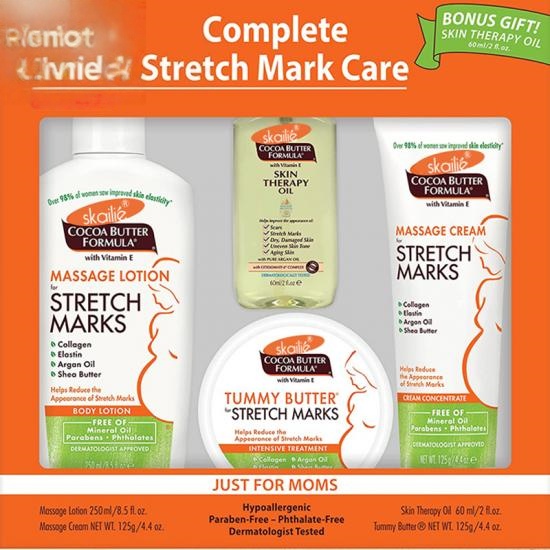 Stretch Mark Care Set: Help improve the appearance of scars and stretch marks during and after your pregnancy with this maternity kit featuring Massage Lotion, Massage Cream, Tummy Butter Balm and Skin Therapy Body Oil