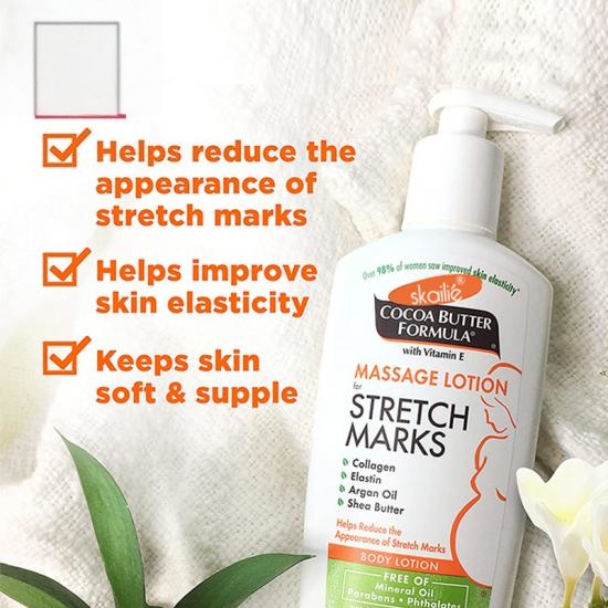Pre-Natal Skin Care: Made with Cocoa Butter to soften and smooth skin, Vitamin E for even and toned appearance, Collagen and Elastin for stretchability and firmness, Co Enzyme Q10 to revitalize, and Pro Vitamin B5 to soothe sore, cracked skin